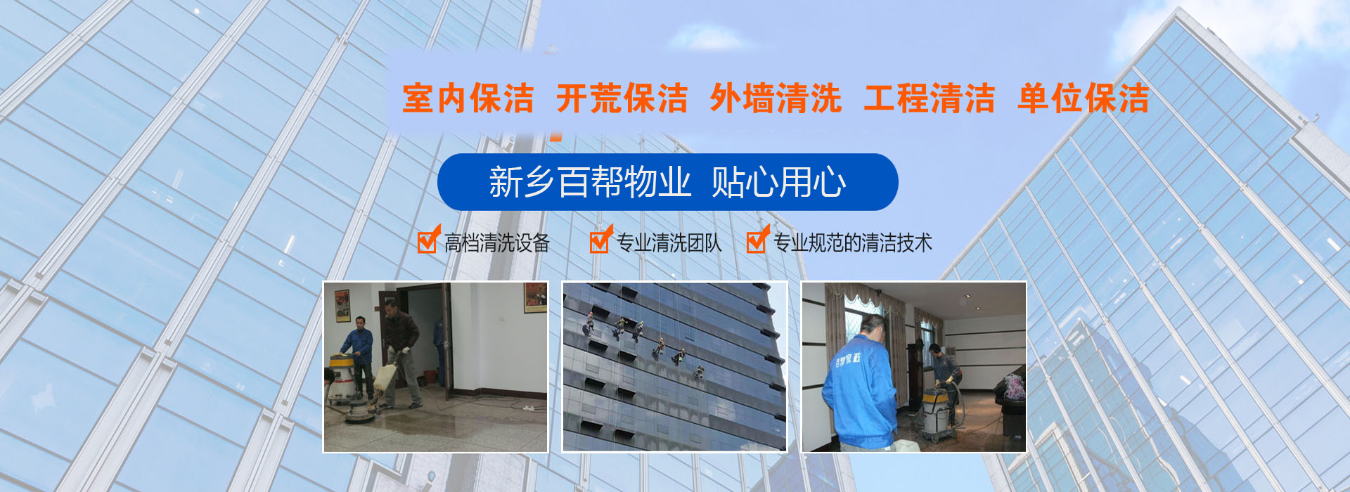 熱烈慶我新鄉(xiāng)百家保潔公司網站建設成功投入運行,公司主要承接新鄉(xiāng)家政保潔、高空外墻粉刷清洗、公司廠房清潔、4S店擦玻璃、家電清洗、甲醛檢測、高溫殺菌消…